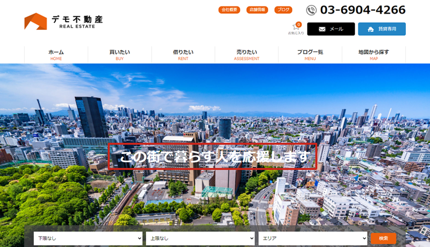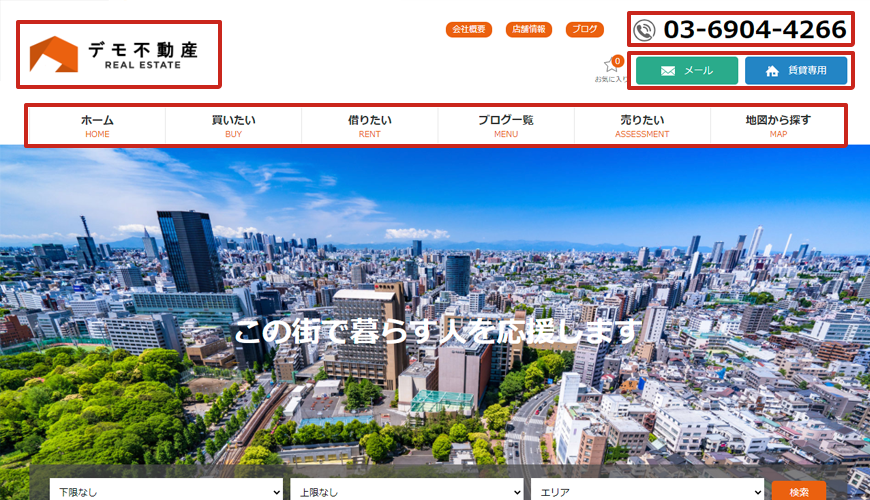 ヘッダーの変更 ヘッダーの変更では自社のロゴを設定や、メニュー、連絡先電話番号変更、リンクボタンの変更を行います。 サイトで各ページに表示されるこの部分です。 管...